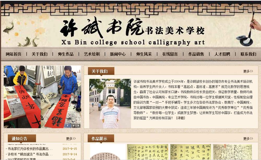 許斌書(shū)院書(shū)法美術(shù)學(xué)校成立于2004年,是許曉斌校長(zhǎng)創(chuàng)辦的濰坊市專業(yè)書(shū)法美術(shù)培訓(xùn)機(jī)構(gòu)。培養(yǎng)學(xué)生兩千余人,書(shū)院本著“高起點(diǎn)、高標(biāo)準(zhǔn)、高要求”規(guī)范化教學(xué)的思想觀念,贏得了社會(huì)認(rèn)可和家長(zhǎng)口碑。書(shū)院教師許校長(zhǎng)親自把關(guān),保證教學(xué)質(zhì)量,教師均來(lái)自中國(guó)書(shū)協(xié)、中國(guó)美院、專業(yè)藝術(shù)學(xué)院,書(shū)院對(duì)每一位學(xué)生根據(jù)其天賦、性格制定合理的培訓(xùn)方案“一對(duì)一”手把手輔導(dǎo)。學(xué)生多次在各級(jí)書(shū)法家協(xié)會(huì)、教育廳、中國(guó)美院、文化部等國(guó)家級(jí)別的大賽中獲獎(jiǎng),連續(xù)三年被中國(guó)美院評(píng)為“優(yōu)秀教學(xué)單位”“優(yōu)秀指導(dǎo)教師”,“教好每一位學(xué)生,成就學(xué)生夢(mèng)想,讓所有學(xué)生寫(xiě)好中國(guó)字,打造成為書(shū)法家的搖籃”為其目標(biāo)和宗旨!